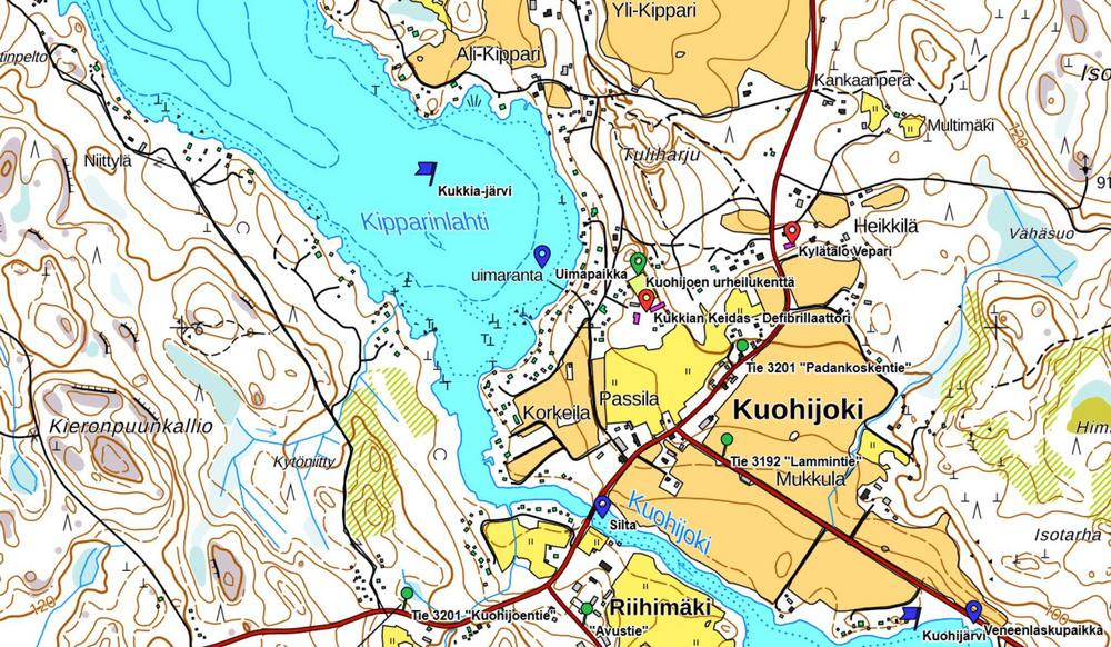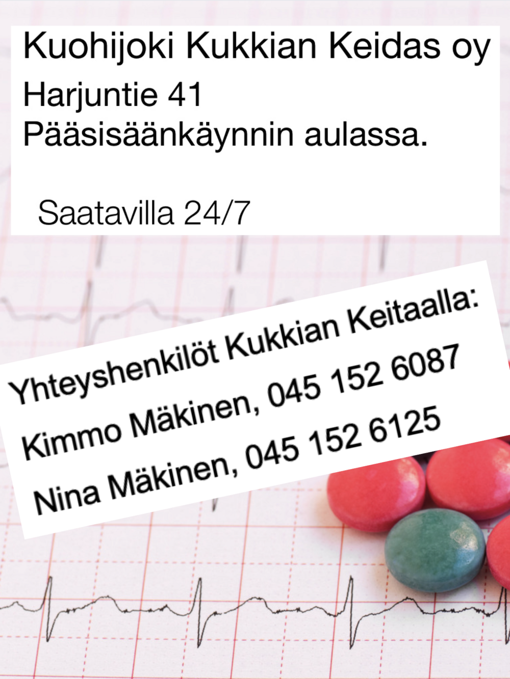 Kuohijoen kylällä, Kukkian Keitaalla Harjuntie 41:ssä, on saatavilla sydäniskuri eli defibrillaattori.